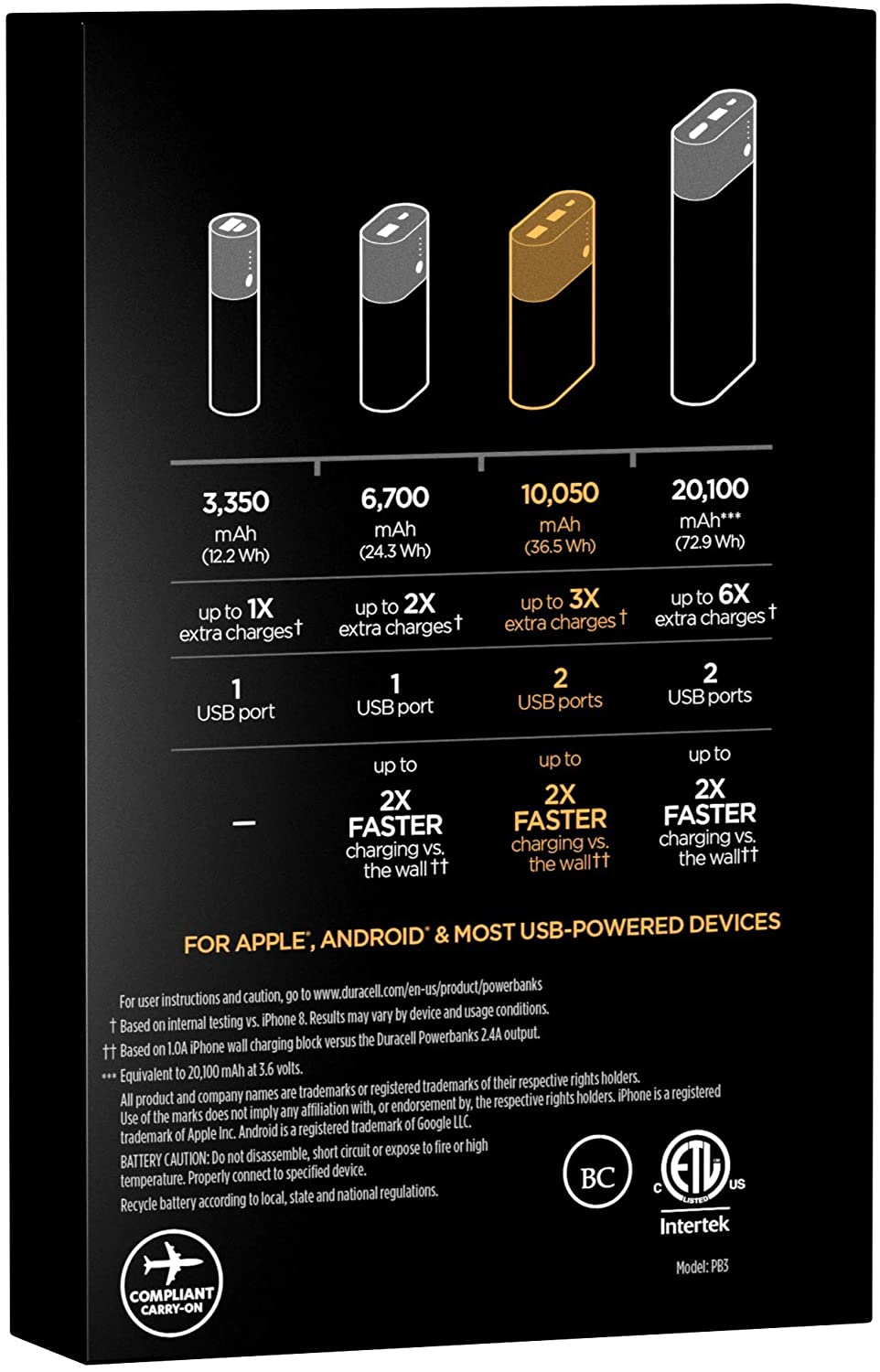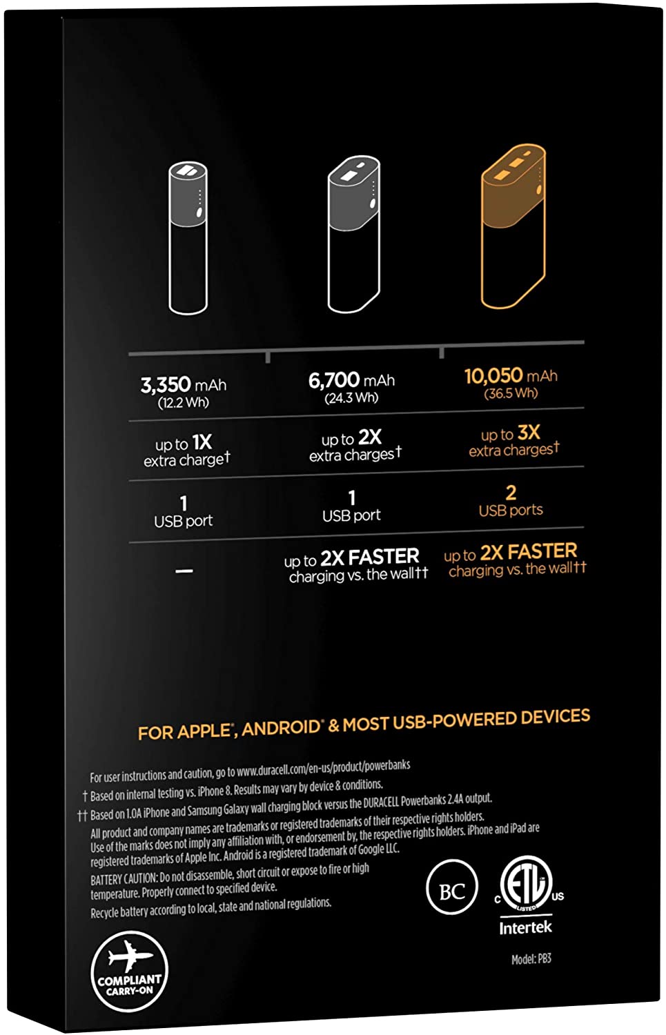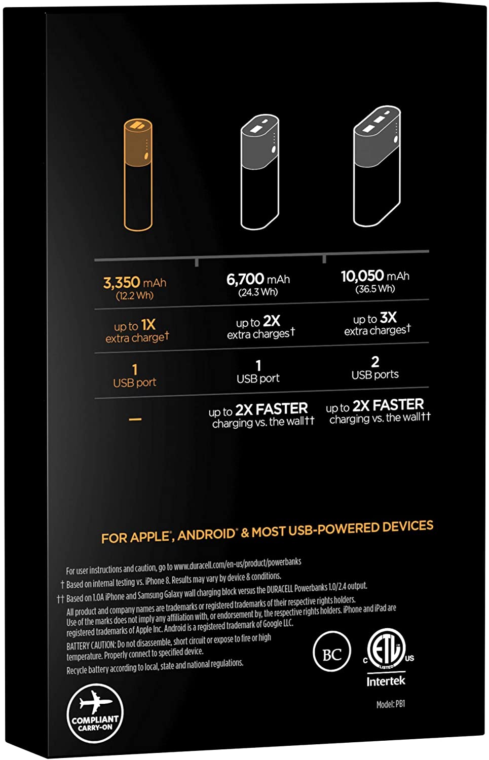 • Duracell, the #1 trusted battery brand, is proud to offer the 10050 mAh Powerbank, as part of Duracell’s trusted lineup of power products.