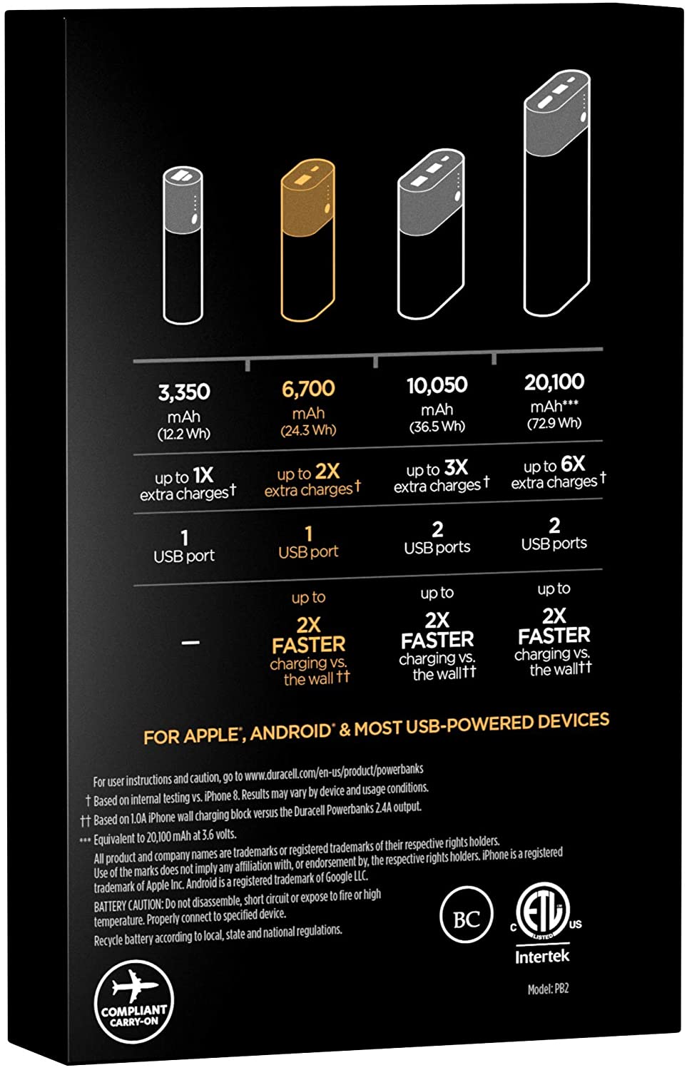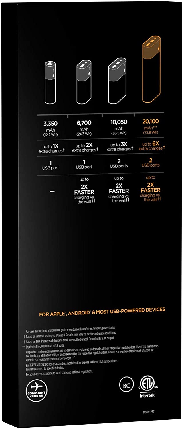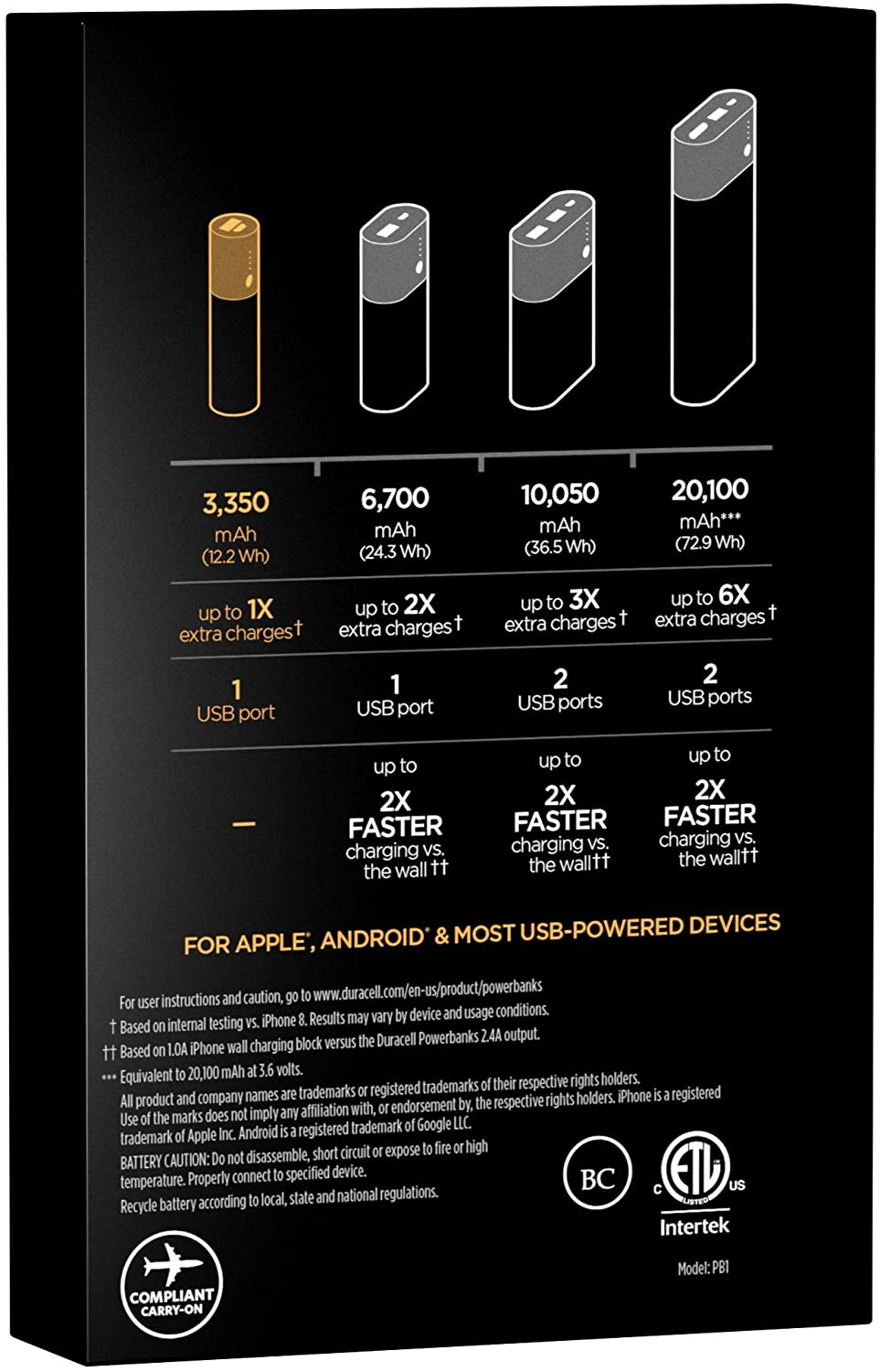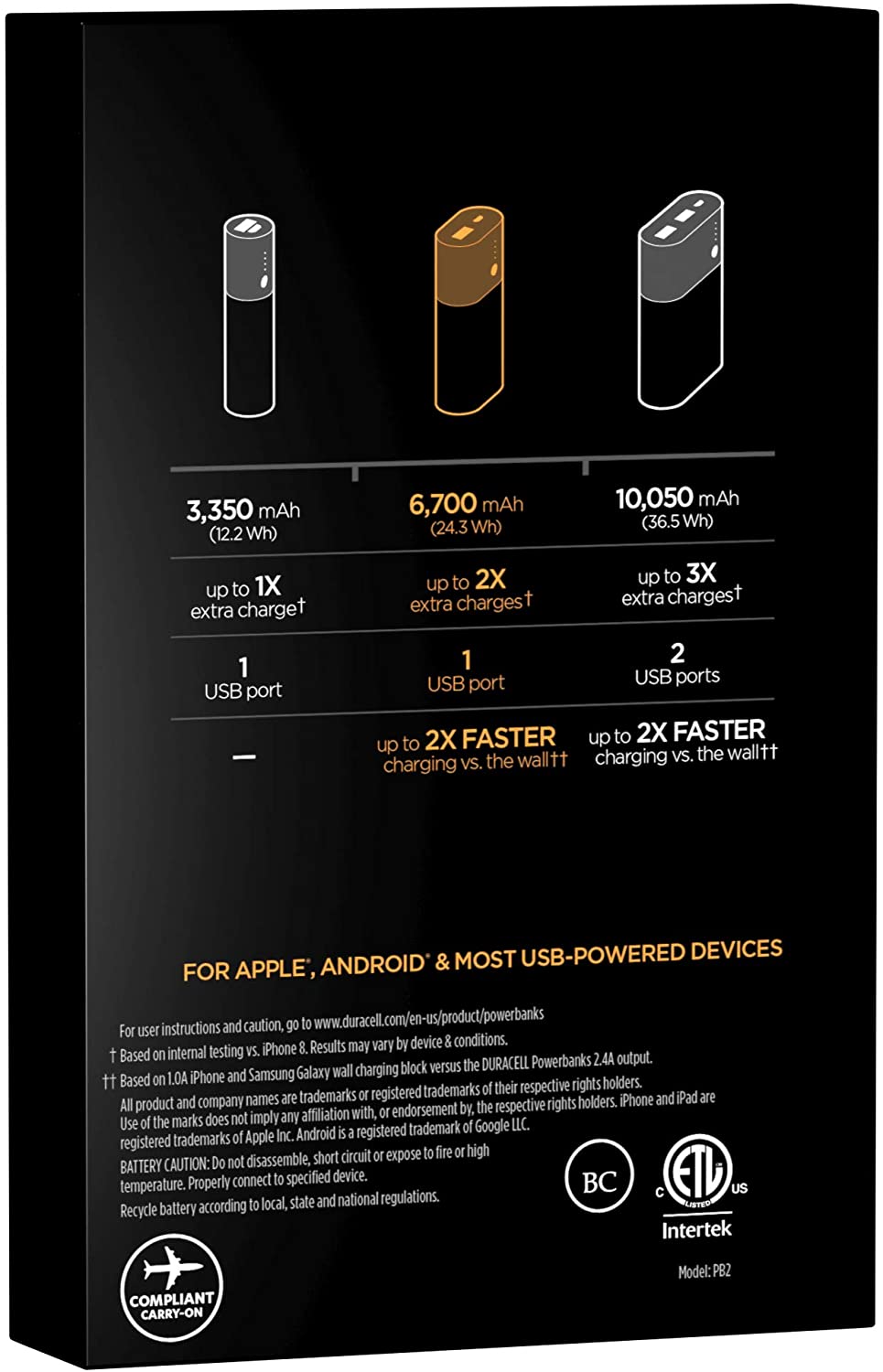 • Duracell, the #1 trusted battery brand, is proud to offer the 10050 mAh Powerbank, as part of Duracell’s trusted lineup of power products.